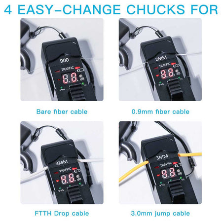 Identify 270 Hz, 1 Hz, 2K Hz modulation signals. Is versatile - Supports all common fibers. There are four adapter heads available: Dia.0.25, DIA.0.9, Dia. 2.0 and Dia.3.0.