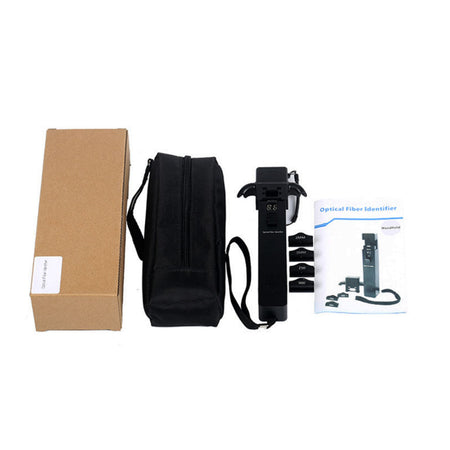 Fiber Tester Kit includes: 1 x Optical Fiber Identifier (battery not included),1 × Manual,1 × Soft bag,4 × Adapter,1 × Sunshade.