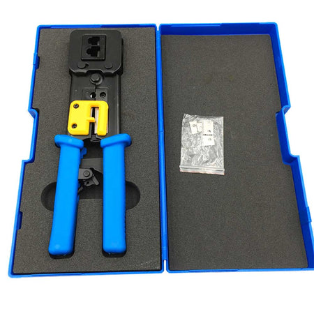 PACKAGE INCLUDING:EZ RJ45 crimp tool, 5 Pcs extra replacement carbon steel blades and a drop-proof protective box.